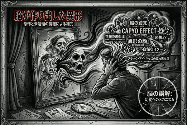 これは、暗闇や鏡の中などで、脳が情報を処理しきれず、恐怖心から『異形の顔』を作り出してしまう現象視覚情報です。