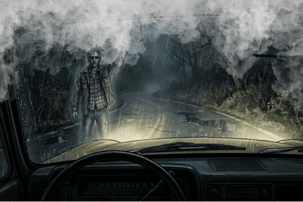深夜の静まり返った道路。月明かりだけが頼りの暗い道を車で走っていると、不意に道端に佇む人影を見つける…。
