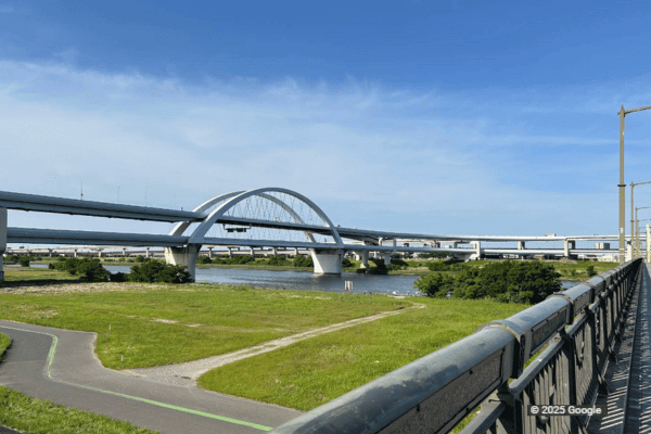 周囲には荒川サイクリングロードが整備されており、橋のたもとには複数の野球場や運動広場、さらには高速道路のジャンクションも存在します。