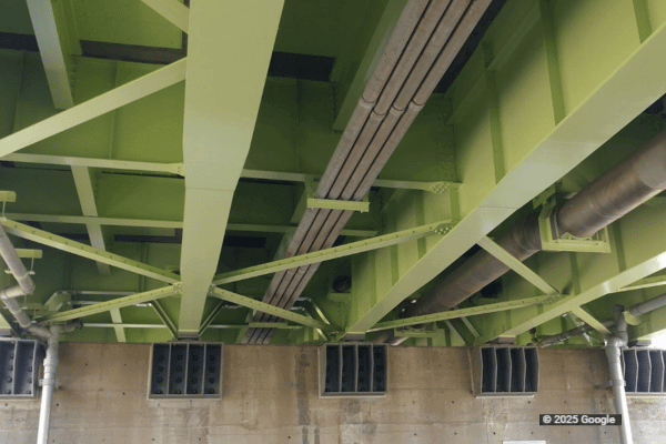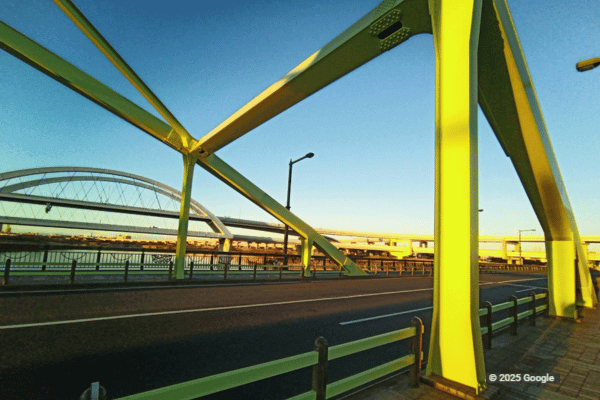 橋の周囲には、荒川沿いの広々とした河川敷や工業地帯が広がり、都市の喧騒から一歩離れたような静かな風景を見せています。しかし、夜になると街灯の少なさと川面の暗さが相まって、静寂とともに独特の空気を漂わせます。